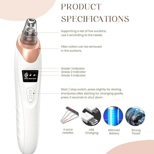 This device is USB rechargeable and easy to use at home, making it suitable for daily skincare routines. The suction technology assists in loosening surface impurities like blackheads, whiteheads, and excess oil. Its ergonomic design and lightweight body make it portable and user‑friendly for regular use.