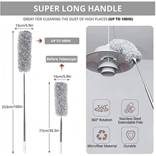 The duster’s flexible head and soft microfiber material trap dust effectively while preventing scratches on surfaces. The long rod gives added reach to clean corners and high spaces with comfort and ease.
