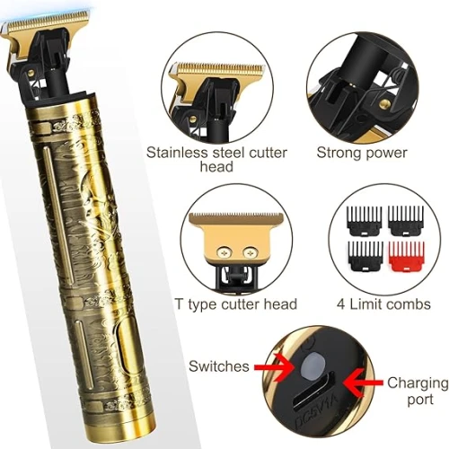 Upgrade your grooming routine with the Vintage T9 Trimmer, a reliable and easy-to-use grooming tool designed for beard trimming, hair cutting, and detailed styling. Its cordless design, sharp blades, and durable metal body make it suitable for both home use and professional grooming.